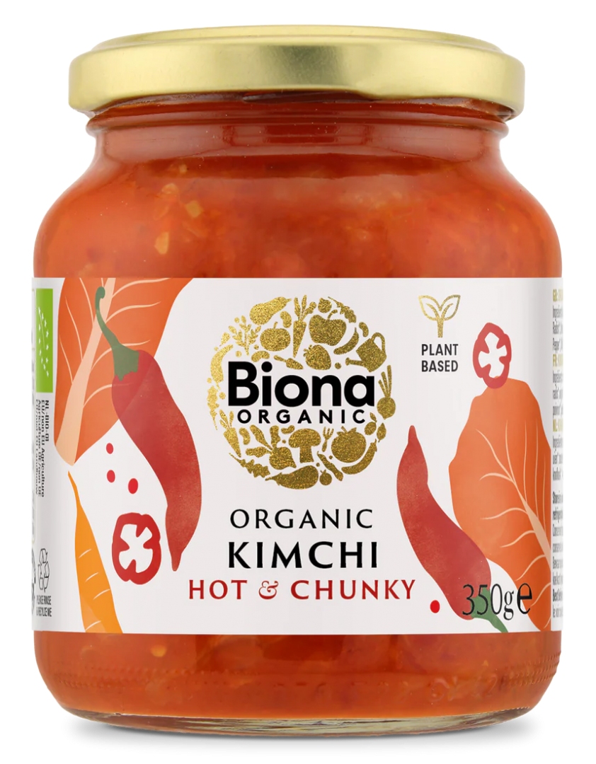 Kimchi-ul picant Biona, facut cu varza Napa bio (baza traditionala a kimchi-ului autentic), impreuna cu morcov, ceapa, usturoi, ghimbir si amestecul picant de condimente, este plin de aroma naturala si textura satisfacatoare la fiecare imbucatura.